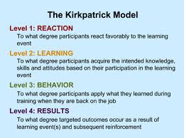 I used the Kirkpatrick Model to evaluate student learning in the IDT Technical Development course. The first level is reaction. I used formative evaluation including: anecdotal notes per student comments, emails, and observations of body language to assess the degree of participants reactions in the course.